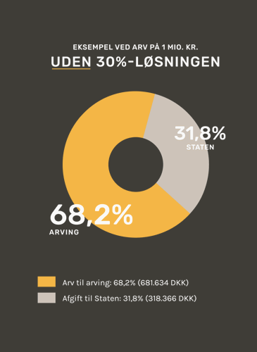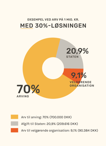 Eksemplerne ovenfor illustrerer, hvordan arvingerne arver 18.366 kr. mere ved at lade en velgørende organisation arve 30% og betale bo- og tillægsboafgiften. Og den velgørende organisation arver omkring 90.000 kr.
